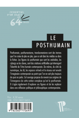 Posthumain, posthumanisme, transhumanisme sont des termes que l’on croise de plus en plus, que ce soit dans les médias ou dans la fiction. Les figures du posthumain que sont les androïdes, les cyborgs ou les clones, sont des créatures artificielles qui interrogent l’identité de l’être humain contemporain. De même, du côté du numérique, les IA, les espaces virtuels et le réseau ont envahi l’imaginaire contemporain au point que l’on ne sait plus toujours de quoi on parle. Cet ouvrage propose de revenir aux origines de l’émergence de cette notion complexe qu’est le posthumain. Il s’agira également d’explorer ces figures et de les replacer dans une réflexion politique et philosophique contemporaine.