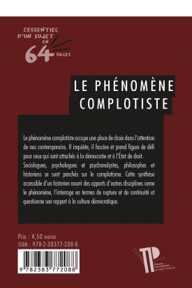 Le phénomène complotiste occupe une place de choix dans l’attention de nos contemporains. Il inquiète, il fascine et prend figure de défi pour ceux qui sont attachés à la démocratie et à l’État de droit. Sociologues, psychologues et psychanalystes, philosophes et historiens se sont penchés sur le complotisme. Cette synthèse accessible d’un historien nourri des apports d’autres disciplines cerne le phénomène, l’interroge en termes de rupture et de continuité et questionne son rapport à la culture démocratique.