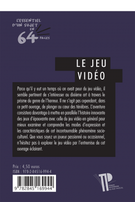 Parce qu'il y eut un temps où on avait peur du jeu vidéo, il semble pertinent de s’intéresser au dixième art à travers le prisme du genre de l’horreur. Il ne s’agit pas cependant, dans ce petit ouvrage, de plonger au cœur des ténèbres. L’aventure consistera davantage à mettre en parallèle l’histoire innovante des jeux d’épouvante avec celle du jeu vidéo en général pour mieux examiner et comprendre les modes d’expression et les caractéristiques de cet incontournable phénomène socioculturel. Que vous soyez un joueur passionné ou occasionnel, n’hésitez pas à explorer le jeu vidéo par l’entremise de cet ouvrage éclairant.
