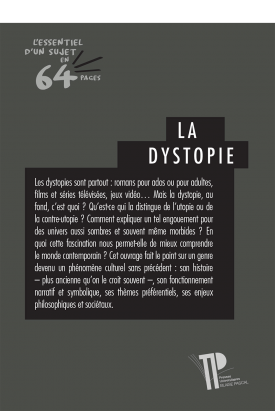 Les dystopies sont partout, ou presque : romans pour ados ou pour adultes, films et séries télévisées, jeux vidéo, publicités… Mais la dystopie, au fond, c'est quoi ? Qu’est-ce qui la distingue de l’utopie comme de la contre-utopie ? Comment expliquer un tel engouement pour des univers aussi sombres et souvent même morbides ? En quoi cette fascination nous permet-elle de mieux comprendre le monde contemporain ?