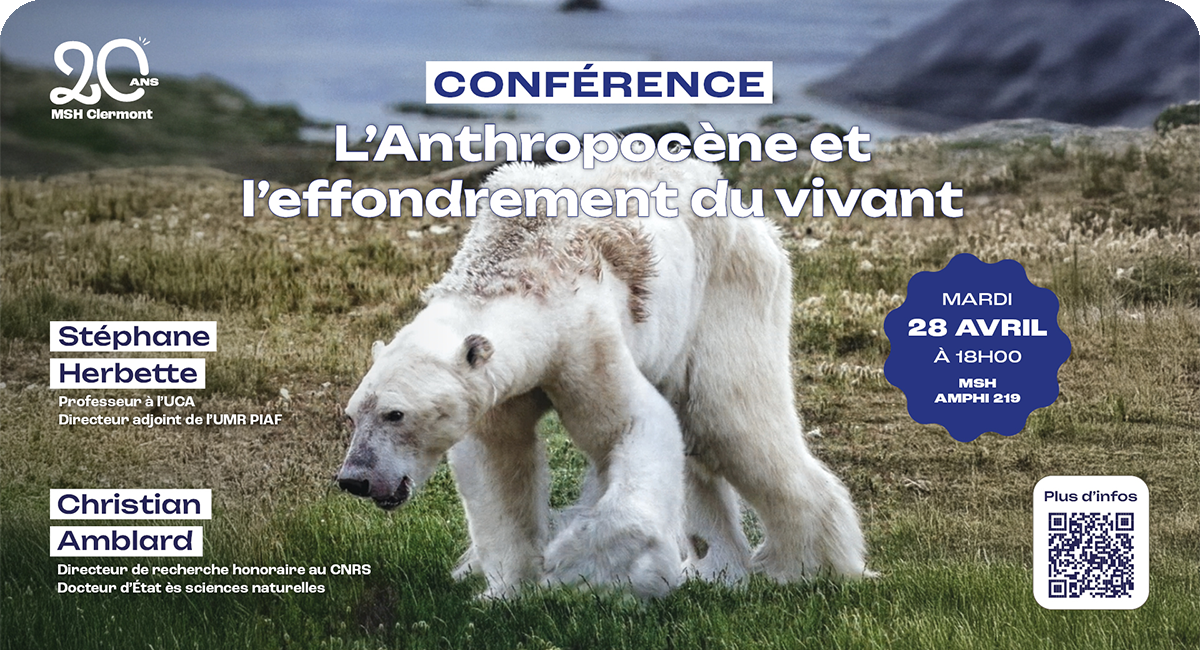 Pourquoi parle-t-on d’une 6ᵉ extinction massive des espèces et en quoi est-elle un problème ? Stéphane Herbette et Christian Amblard présenteront leur ouvrage L'effondrement du vivant lors d'une conférence le mardi 28 avril 2026 à la Maison des Sciences Humaines de Clermont-Ferrand.