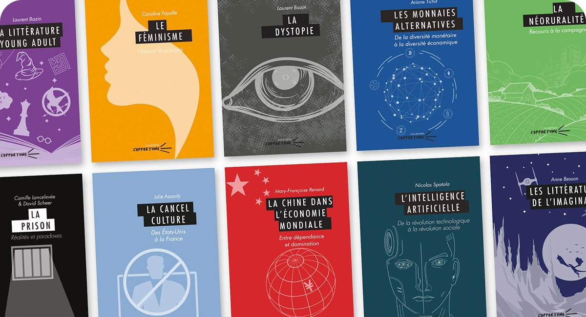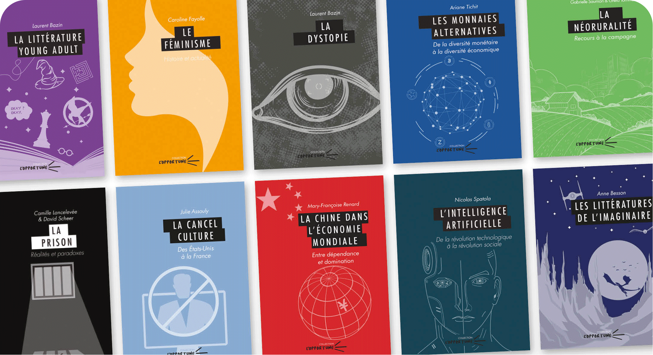 Lancée en 2018, la collection « L’Opportune » compte désormais 28 titres aux formats papier, ePub et PDF portant sur des tendances culturelles (la dystopie, les séries TV, l’explosion du manga), des enjeux macro-économiques ou des questions de société (le phénomène du néoruralisme, la réalité carcérale en France, ou encore l’impact des sondages sur l’opinion publique).