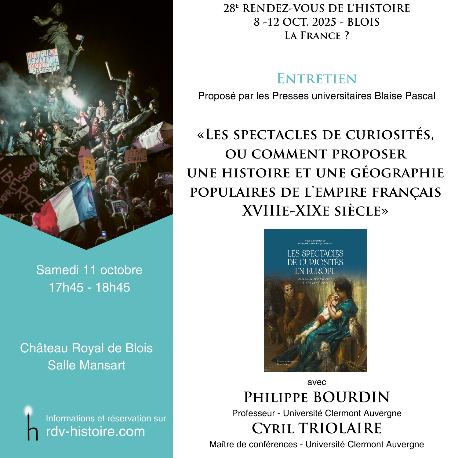 Les PUBP proposent cette année dans le cadre de la programmation du Festival la rencontre intitulée « Les spectacles de curiosités, ou comment proposer une histoire et une géographie populaires de l'empire français (XVIIIe-XIXe siècles) ». Philippe Bourdin et Cyril Triolaire feront revivre les curiosités offertes à l’époque à l’occasion des grandes foires, sur les places publiques, dans la rue, les auberges, les maisons privées aux publics les plus divers. Des représentations d’un univers onirique qui jouaient avec et se jouaient de la réalité française, réécrivant les horizons d’un empire colonial, d’une humanité entre science et charlatanisme, d’une histoire dont on fait s’entrechoquer les périodes et les héros.