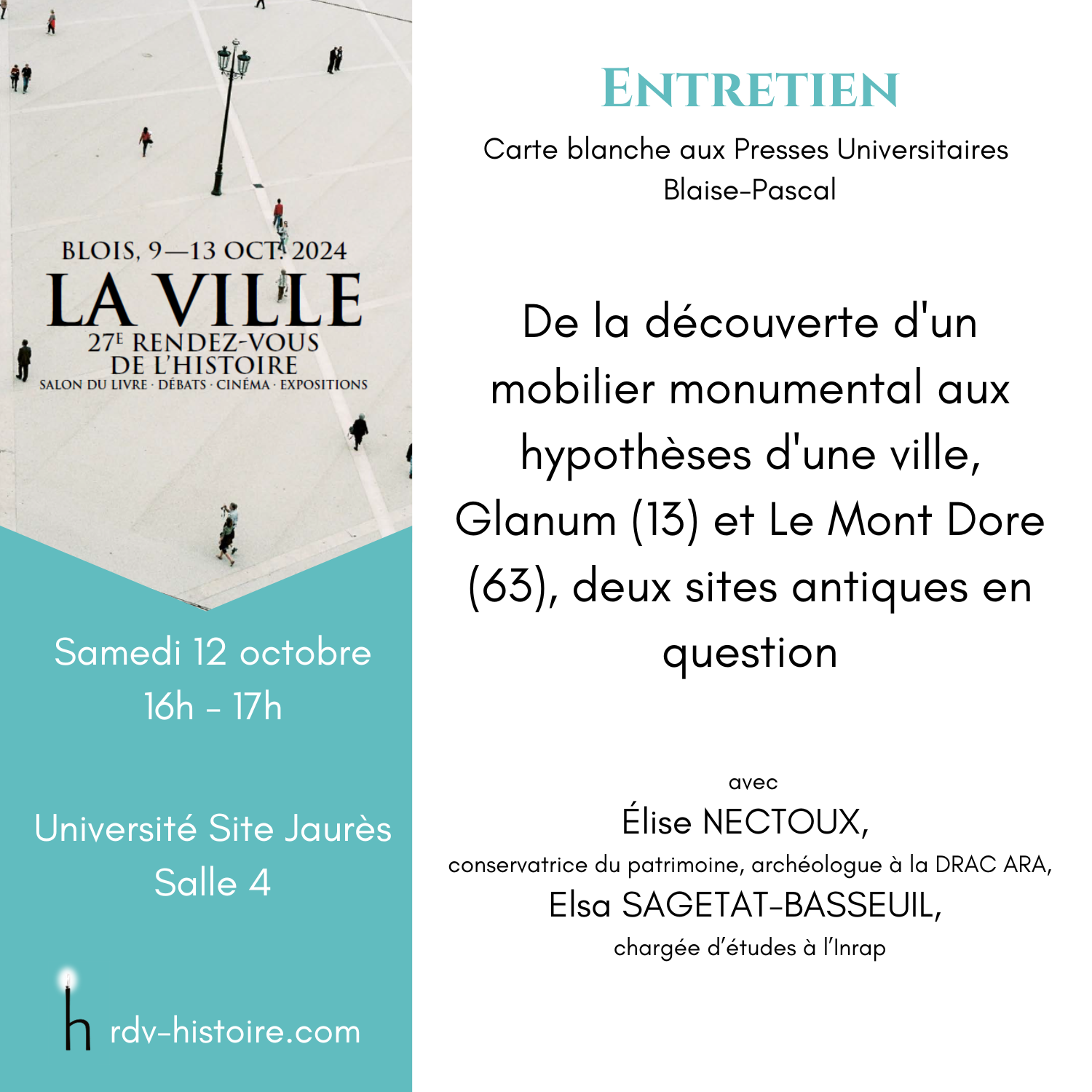 Les PUBP vous proposent cette année la Carte blanche « De la découverte d’un mobilier monumental aux hypothèses d’une ville. Glanum (13) et Le Mont-Dore (63), deux sites antiques en question » animée par Elsa Sagetat-Basseuil (chargée d’études à l’Inrap sur le site de Marseille et chercheuse à l’Iraa) et Élise Nectoux (conservatrice du patrimoine, archéologue).