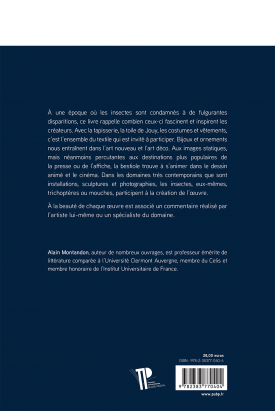 À une époque où les insectes sont condamnés à de fulgurantes disparitions, ce livre rappelle combien ceux-ci fascinent et inspirent les créateurs. Avec la tapisserie, la toile de Jouy, les costumes et vêtements, c'est l’ensemble du textile qui est invité à participer. Bijoux et ornements nous entraînent dans l’art nouveau et l’art déco. Aux images statiques, mais néanmoins percutantes aux destinations plus populaires de la presse ou de l’affiche, la bestiole trouve à s’animer dans le dessin animé et le cinéma. Dans les domaines très contemporains que sont installations, sculptures et photographies, les insectes, eux-mêmes, trichoptères ou mouches, participent à la création de l’œuvre. À la beauté de chaque œuvre est associé un commentaire réalisé par l’artiste lui-même ou un spécialiste du domaine.