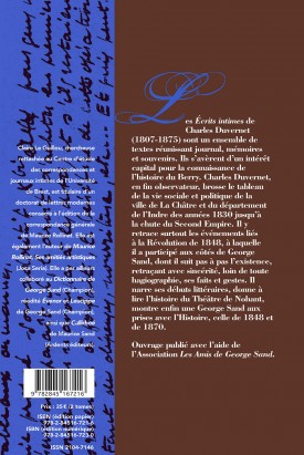 Les Écrits intimes de Charles Duvernet (1807-1875) sont un ensemble de textes réunissant journal, mémoires et souvenirs. Ils s'avèrent d’un intérêt capital pour la connaissance de l’histoire du Berry. Charles Duvernet, en fin observateur, brosse le tableau de la vie sociale et politique de la ville de La Châtre et du département de l’Indre des années 1830 jusqu’à la chute du Second Empire. Il y retrace surtout les événements liés à la Révolution de 1848, à laquelle il a participé aux côtés de George Sand, dont il suit pas à pas l’existence, retraçant avec sincérité, loin de toute hagiographie, ses faits et gestes. Il narre ses débuts littéraires, donne à lire l’histoire du Théâtre de Nohant, montre enfin une George Sand aux prises avec l’Histoire, celle de 1848 et de 1870.