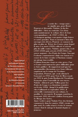 La sortie des « temps noirs » ne signifie pas, pour Henri Pourrat et Alexandre Vialatte, la fin des difficultés – bien au contraire. Les deux amis maintiennent le rythme élevé de leur correspondance : de 1947 à 1951, ils s’échangent quelque cent quatre-vingts lettres et cartes postales. Tout en menant à bien des ouvrages très divers, Pourrat se consacre de plus en plus au Trésor des Contes, pour lequel il aura à sa mort (1959) collecté et réécrit plus de mille contes. Vialatte, quant à lui, écrit (1947-1949) puis réécrit (1949-1951) son œuvre majeure : Les Fruits du Congo. Son ami l’exhorte constamment à finir son roman et à cesser de le faire reculer à l’horizon comme un mirage inaccessible.