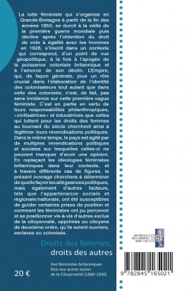 En replaçant les idéologies féministes britanniques dans leur contexte, et à travers différents cas de figures, le présent ouvrage cherchera à déterminer de quelle façon les allégeances politiques, mais également d’autres facteurs, tels que l’appartenance sociale et régionale/nationale, ont été susceptibles de guider certaines prises de position et comment les féministes ont pu percevoir et se positionner vis-à-vis d’autres exclus de la citoyenneté, opprimés ou citoyens de deuxième ordre, qu’ils soient ouvriers, esclaves ou colonisés.