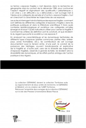 Le terme « espaces fragiles » s'est répandu dans la recherche en géographie dans le courant de la décennie 1980, pour contourner l’aspect négatif et stigmatisant des qualificatifs « périphériques », « en crise », « en difficulté » ou « défavorisés ». Cet ouvrage met à l’épreuve la catégorie de pensée et d’action « espace fragile », tout en cherchant à caractériser les trajectoires de ces espaces.