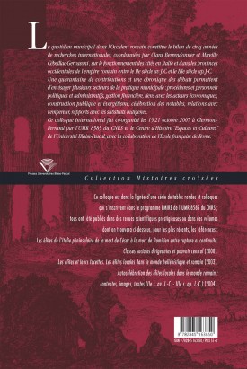 Le quotidien municipal dans l'Occident romain constitue le bilan de cinq années de recherches internationales sur le fonctionnement des cités en Italie et dans les provinces occidentales de l'empire romain entre le IIe siècle av. J.-C. et le IIIe siècle apr. J.-C. Une quarantaine de contributions et une chronique des débats permettent d’envisager plusieurs secteurs de la pratique municipale : procédures et personnels politiques et administratifs, gestion financière, liens avec les acteurs économiques, construction publique et évergétisme, célébration des notables, relations avec l’empereur, rapports avec les substrats indigènes.