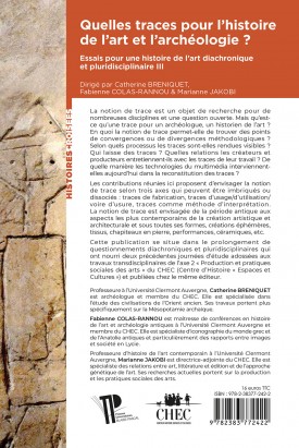 Les contributions réunies ici proposent d’envisager la notion de trace selon trois axes qui peuvent être imbriqués ou dissociés : traces de fabrication, traces d’usage/d’utilisation/voire d’usure, traces comme méthode d’interprétation. La notion de trace est envisagée de la période antique aux aspects les plus contemporains de la création artistique et architecturale et sous toutes ses formes, créations éphémères, tissus, chapiteaux en pierre, performances, céramiques, etc.