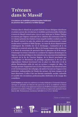 Tréteaux dans le Massif est un projet hybride faisant dialoguer chercheurs et artistes autour des circulations et mobilités professionnelles théâtrales à travers le Massif central entre 1750 et 1910, initié par le Wakan Théâtre et soutenu par l’Agence nationale de la cohésion des territoires (ANCT). Ce volume présente les résultats d’une enquête inédite conduite au cœur du Massif central à la suite des artistes de scène professionnels y ayant évolué entre Lumières et Belle Époque. Au cœur de douze départements s’imbriquent des échelles de vie et d’échanges ; l’animation de la vie théâtrale se construit autour de villes et de bourgs toujours plus nombreux à se doter de structures de spectacle fixes et pérennes au fil du temps. S’immerger là revient à dessiner et à analyser les régimes dramatiques en vigueur, ceux des privilèges et des initiatives des nouveaux intermédiaires culturels de la fin de l’Ancien Régime, de la liberté proclamée par Le Chapelier en Révolution, du privilège napoléonien et de son néo-régionalisme théâtral fonctionnel mis en place en 1806-1807 et de la pleine libéralisation enfin de tout un secteur à compter de 1864.