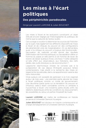 Les mises à l'écart et les exclusions constituent un objet souvent négligé par l’historiographie du politique, de même que la caducité de l’acteur public. Leur prise en compte permet toutefois d’interroger la linéarité de l’action politique dans toute sa complexité. Cet ouvrage a vocation à déterminer les sources de l’historien sur le sujet, mais également les différents dispositifs de mises à l’écart et de critiques du pouvoir en des configurations de périphéricité voire de marginalisation. On se demandera, également, si la critique du pouvoir a toujours été fonctionnelle : l’accusation de caducité a-t-elle donné des résultats (l’élimination de l’homme politique), ou l’acceptation d’être un homme du passé a-t-elle permis à cet homme de durer, de revenir, de laisser quelque chose, une trace ? Cette catégorie a-t-elle offert aux observateurs, aux historiens, des clefs réelles, des outils d’analyse ou de reconstruction ?