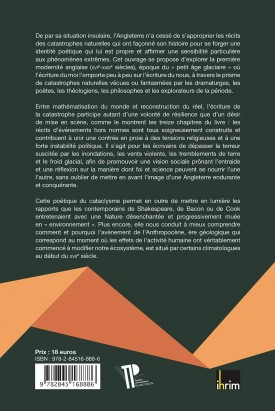 De par sa situation insulaire, l'Angleterre n'a cessé de s’approprier les récits des catastrophes naturelles qui ont façonné son histoire pour se forger une identité poétique qui lui est propre et affirmer une sensibilité particulière aux phénomènes extrêmes. Cet ouvrage se propose d’explorer la première modernité anglaise (XVIe-XVIIIe siècle), époque du « petit âge glaciaire » où l’écriture du moi l’emporte peu à peu sur l’écriture du nous, à travers le prisme de catastrophes naturelles vécues ou fantasmées par les dramaturges, les poètes, les théologiens, les philosophes et les explorateurs de la période.
