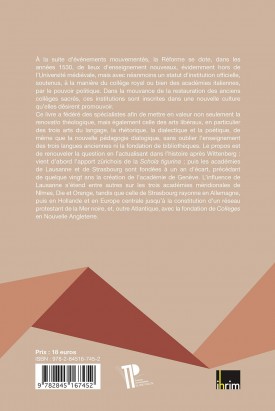 Ce livre a fédéré des spécialistes afin de mettre en valeur non seulement la renovatio théologique, mais également celle des arts libéraux, en particulier des trois arts du langage, la rhétorique, la dialectique et la poétique, de même que la nouvelle pédagogie dialogique, sans oublier l’enseignement des trois langues anciennes ni la fondation de bibliothèques. Le propos est de renouveler la question dans toute son envergure en l’actualisant dans l’histoire : vient d’abord l’apport zürichois de la Schola tigurina, puis la fondation de l’Académie de Lausanne, et son influence sur les trois académies méridionales de Nîmes, Die et Orange, et celle de l’Académie de Strasbourg, un an après Lausanne, et son influence dans le sud de l’Allemagne puis en Hollande et dans l’Europe centrale jusqu’à la constitution d’un réseau protestant de la Mer noire.
