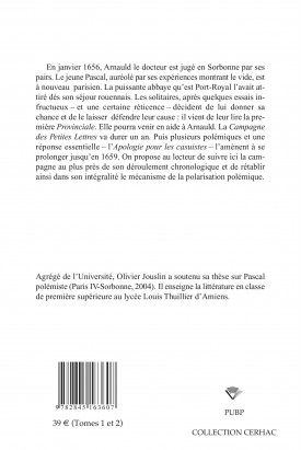 En janvier 1656, Arnauld le docteur est jugé en Sorbonne par ses pairs. Le jeune Pascal, auréolé par ses expériences montrant le vide, est à nouveau parisien. La puissante abbaye qu’est Port-Royal l’avait attiré dès son séjour rouennais. Les solitaires, après quelques essais infructueux – et une certaine réticence – décident de lui donner sa chance et de le laisser défendre leur cause : il vient de leur lire la première Provinciale. Elle pourra venir en aide à Arnauld. La Campagne des Petites Lettres va durer un an. Puis plusieurs polémiques et une réponse essentielle – l’Apologie pour les casuistes – l’amènent à se prolonger jusqu’en 1659. On propose au lecteur de suivre ici la campagne au plus près de son déroulement chronologique et de rétablir ainsi dans son intégralité le mécanisme de la polarisation polémique.