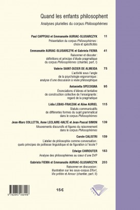 Ce numéro consacre la présentation du travail pluridisciplinaire réalisé par des chercheurs en sciences du langage, en psychologie et en sciences de l'éducation sur la base d'un corpus commun. Le corpus Philosophèmes, basé sur le recueil et la transcription de discussions à visée philosophique tenues dans des classes de l’école primaire et du collège, est étudié en tout ou partie par chaque spécialiste. Les mouvements de pensée présents dans les dialogues entre l’enseignant et les élèves, ou entre les élèves eux-mêmes, sont passés au crible pour rendre compte de la richesse d’une pratique pédagogique innovante. Les spécialistes se saisissent, au cœur même de la genèse des discussions, d’éléments jugés représentatifs : focalisation, glissements sémantiques, formes grammaticales, mouvements discursifs, boucles conversationnelles, figures de raisonnements, préservation de face, usages lexicaux, dynamique de l’activité, étayage enseignant, exigence de pensée.