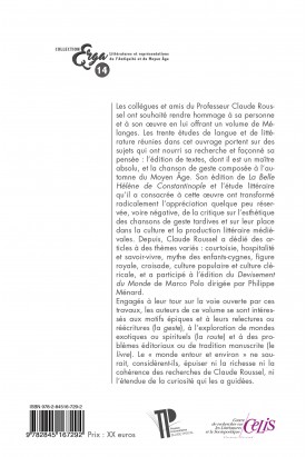 Les collègues et amis du Professeur Claude Roussel ont souhaité rendre hommage à sa personne et à son œuvre en lui offrant un volume de Mélanges. Les trente études de langue et de littérature réunies dans cet ouvrage portent sur des sujets qui ont nourri sa recherche et façonné sa pensée : l'édition de textes, dont il est un maître absolu, et la chanson de geste composée à l’automne du Moyen Âge. Son édition de La Belle Hélène de Constantinople et l’étude littéraire qu’il a consacrée à cette œuvre ont transformé radicalement l’appréciation quelque peu réservée, voire négative, de la critique sur l’esthétique des chansons de geste tardives et sur leur place dans la culture et la production littéraire médiévales. Depuis, Claude Roussel a dédié des articles à des thèmes variés : courtoisie, hospitalité et savoir-vivre, mythe des enfants-cygnes, figure royale, croisade, culture populaire et culture cléricale, et a participé à l’édition du Devisement du Monde de Marco Polo dirigée par Philippe Ménard.