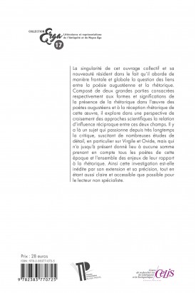 La singularité et la nouveauté de cet ouvrage collectif résident dans le fait qu'il aborde de manière frontale et globale la question des liens entre la poésie augustéenne et la rhétorique. Composé de deux grandes parties consacrées respectivement aux formes et significations de la présence de la rhétorique dans l’œuvre des poètes augustéens et à la réception rhétorique de cette œuvre, il explore dans une perspective de croisement des approches scientifiques la relation d’influence réciproque entre ces deux champs. C’est ainsi une investigation inédite par son extension et sa précision, tout en étant claire et accessible pour le lecteur non spécialiste, qui est proposée sur un sujet qui passionne depuis très longtemps la critique, suscitant de nombreuses études de détail, en particulier sur Virgile et Ovide, mais qui n’a jusqu’à présent donné lieu à aucune somme prenant en compte tous les poètes de cette époque et l’ensemble des enjeux de leur rapport à la rhétorique.