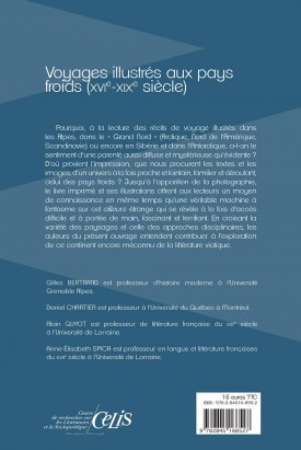 Pourquoi, à la lecture des récits de voyage illustrés dans les Alpes, dans le « Grand Nord » (Arctique, Nord de l'Amérique, Scandinavie) ou encore en Sibérie et dans l’Antarctique, a-t-on le sentiment d’une parenté aussi diffuse et mystérieuse qu’évidente ? D’où provient l’impression, que nous procurent les textes et les images, d’un univers à la fois proche et lointain, familier et déroutant, celui des pays froids ? Jusqu’à l’apparition de la photographie, le livre imprimé et ses illustrations offrent aux lecteurs un moyen de connaissance en même temps qu’une véritable machine à fantasme sur cet ailleurs étrange qui se révèle à la fois d’accès difficile et à portée de main, fascinant et terrifiant. En croisant la variété des paysages et celle des approches disciplinaires, les auteurs du présent ouvrage entendent contribuer à l’exploration de ce continent encore méconnu de la littérature viatique.