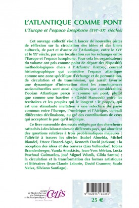 Cet ouvrage collectif vise à lancer de nouvelles pistes de réflexion sur la circulation des idées et des biens culturels, de part et d'autre de l'Atlantique, entre le XVIe et le XXe siècle, par une focalisation sur les échanges entre l'Europe et l'espace lusophone. Pour cela les organisateurs du volume ont pris comme point de départ des dispositifs méthodologiques chers à l’Atlantic history, courant historiographique qui considère l’espace atlantique comme une zone spécifique d’échange et de permutation, de circulation et de transmission, qui aurait favorisé une dynamique d’interaction dont les conséquences socioculturelles sont aussi singulières que considérables. L’océan Atlantique perçu « comme un pont, plutôt que comme une barrière » (David Hancock) entre les territoires et les peuples qui le longent : le propos, qui est une stimulante invitation à une relecture du passé commun entre l’Europe, l’Amérique et l’Afrique, connaît différentes déclinaisons, au gré des contributions de ceux qui acceptent le pari qu’il implique. Ce livre rassemble des essais rédigés par des chercheurs rattachés à des laboratoires de différents pays, qui abordent des questions relatives à trois problématiques majeures : l’altérité à travers les siècles ; la réception des idées et des œuvres ; la circulation et la transformation des formes artistiques et littéraires.