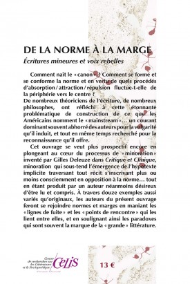 La marginalisation des voix minoritaires – et le plus souvent rebelles – a, paradoxalement, redynamisé les arts. Et les écritures de la contestation ont parfois donné naissance à des genres nouveaux (récits d'esclaves, écritures amérindiennes…). Il est particulièrement intéressant d’analyser, ainsi que Gilles Deleuze le proposait, comment l’ « usage mineur » d’une langue peut, en la déstabilisant, prendre une dimension aussi universelle que l’expression de la culture dominante dans laquelle elle s’inscrit en filigrane. Glissant de la marge à la norme, ces témoignages et récits perdent-ils de leur valeur critique, ou bien gagnent-ils en force de conviction ? Se saisissant d’œuvres appartenant à la littérature des XIXe et XXe siècles, une douzaine d’auteurs abordent ces questions sous leurs différentes facettes. En fin de volume est proposée une bibliographie thématique générale.