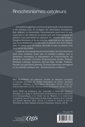 L’objet de cet ouvrage est une revalorisation de l’anachronisme dont nous montrons aussi bien le potentiel poïétique que la dimension heuristique et interprétative de l’anachronisme en littérature. Cervantès, Camões, Chateaubriand, Gautier, Flaubert, Rimbaud Laforgue, Queneau, Perrault, Peter Handke, Thiéfaine, Pasolini, Jacques Demy, Kennely, Thomas Ostermeier, témoignent ici du potentiel poétique des « anachronismes créateurs ».