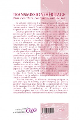 L'auteur d’un écrit à caractère autobiographique est mû par le désir de transmettre une expérience et une pensée. L’écriture de soi la plus répandue est une écriture quotidienne pragmatique, avec une visée souvent didactique, qui ne concerne pas seulement les écrivains. Les ruptures existentielles, nombreuses au XXe siècle, favorisent cette production. Ce savoir, d’ordre individuel, peut cependant devenir celui de tout un groupe, voire d’un peuple, lorsqu’il s’inscrit dans un contexte historique et politique tel que l’expérience des camps, de l’exil ou de l’émigration. L’ouvrage met l’accent sur l’influence de la relation intergénérationnelle, dont les récits de famille sont un vecteur, sur la construction de l’identité. Or celle-ci repose sur la reconstruction de la filiation. L’autobiographie pose ainsi la question de la représentation, voire de la construction de l’héritage culturel, qui est une préoccupation fondamentale de la littérature de l’extrême contemporain.