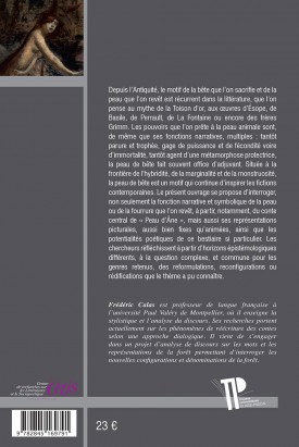 Depuis l’Antiquité, le motif de la bête que l’on sacrifie et de la peau que l’on revêt est récurrent dans la littérature, que l’on pense au mythe de la Toison d’or, aux œuvres d’Ésope, de Basile, de Perrault, de La Fontaine ou encore des frères Grimm. Les pouvoirs que l’on prête à la peau animale sont, de même que ses fonctions narratives, multiples : tantôt parure et trophée, gage de puissance et de fécondité voire d’immortalité, tantôt agent d’une métamorphose protectrice, la peau de bête fait souvent office d’adjuvant. Située à la frontière de l’hybridité, de la marginalité et de la monstruosité, la peau de bête est un motif qui continue d’inspirer les fictions contemporaines. Le présent ouvrage se propose d’interroger, non seulement la fonction narrative et symbolique de la peau ou de la fourrure que l’on revêt, à partir, notamment, du conte central de « Peau d’Âne », mais aussi ses représentations picturales, aussi bien fixes qu’animées, ainsi que les potentialités poétiques de ce bestiaire si particulier. Les chercheurs réfléchissent à partir d’horizons épistémologiques différents, à la question complexe, et commune pour les genres retenus, des reformulations, reconfigurations ou rédifications que le thème a pu connaître.