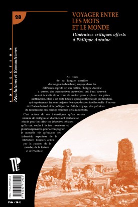 Au cours de sa longue carrière d'enseignant-chercheur engagé dans les différents aspects de son métier, Philippe Antoine a ouvert des perspectives nouvelles, qui l’ont souvent amené à sortir de sa zone de confort pour explorer des pistes inattendues. Mais il est resté fidèle à quelques thèmes de prédilection, qui représentent les axes majeurs de sa production intellectuelle : l’œuvre de Chateaubriand et la poétique du récit de voyage, des prémices du romantisme aux confins extrêmes de la modernité.