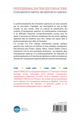 Cet ouvrage issu d'un colloque international examine quelques questions que soulèvent ces réformes et leurs multiples conséquences dans plusieurs pays (France, Algérie, Maroc, Tunisie, Québec, Grèce), notamment à travers trois principales dimensions : les mutations dans l'enseignement supérieur et la professionnalisation, les dispositifs de professionnalisation et d'insertion des diplômés et enfin les résultats des réformes de l'enseignement supérieur dans des contextes internationaux.