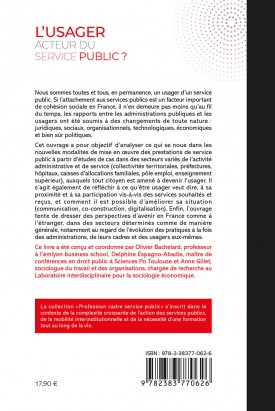 Cet ouvrage a pour objectif d’analyser ce qui se noue dans les nouvelles modalités de mise en œuvre des prestations de service public à partir d’études de cas dans des secteurs variés de l’activité administrative et de service (collectivités territoriales, préfectures, hôpitaux, caisses d’allocations familiales, pôle emploi, enseignement supérieur), auxquels tout citoyen est amené à devenir l’usager. Il s’agit également de réfléchir à ce qu’être usager veut dire, à sa proximité et à sa participation vis-à-vis des services souhaités et reçus, et comment il est possible d’améliorer sa situation (communication, co-construction, digitalisation).