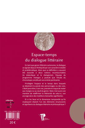 En tant que genre littéraire autonome, le dialogue se signale depuis l'Antiquité par son caractère instable et problématique. Alors que sa définition a souvent été associée à deux notions incontournables (la dialectique et le dialogisme), l'équipe du programme Dialogos a postulé que l’étude du chronotope constituait une entrée pertinente. Privilégier l’espace et le temps dans lesquels se déploient la parole des personnages ou des voix, c’était peut-être, il est vrai, prendre le risque de rester aux marges ou au seuil du genre. Mais c’est aussi une manière de réaffirmer la littérarité de celui-ci, son ancrage dans des traditions textuelles signifiantes. Et si les lieux et la dimension temporelle qu’ils impliquent étaient l’un des éléments structurants et signifiants du dialogue littéraire et philosophique ?